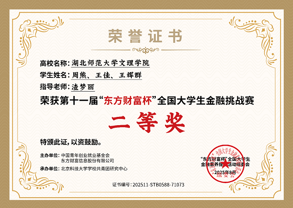 近日,由共青团中央青年发展部指导,中国青年创业就业基金会与东方财富信息股份有限公司联合主办的第十一届“东方财富杯”全国大学生金融挑战赛已圆满落幕,我院学子在比赛中展现出扎实的专业知识、良好的分析能力和团队协作能力,本次比赛获得全国二等奖1项、三等奖1项,省级一等奖2项、三等奖4项。
