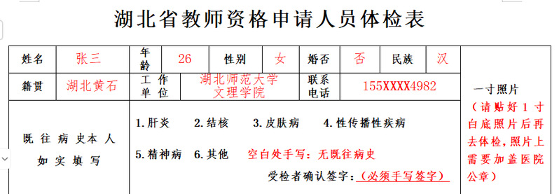 我校统一指定的省教师资格认定中心备案医院为黄石市二医院,需双面打印(附件2,体检表有效期为一年。体检表上需有“合格”字样。体检表中规定项目都要做,有备孕的老师不做胸透只能视为不合格。