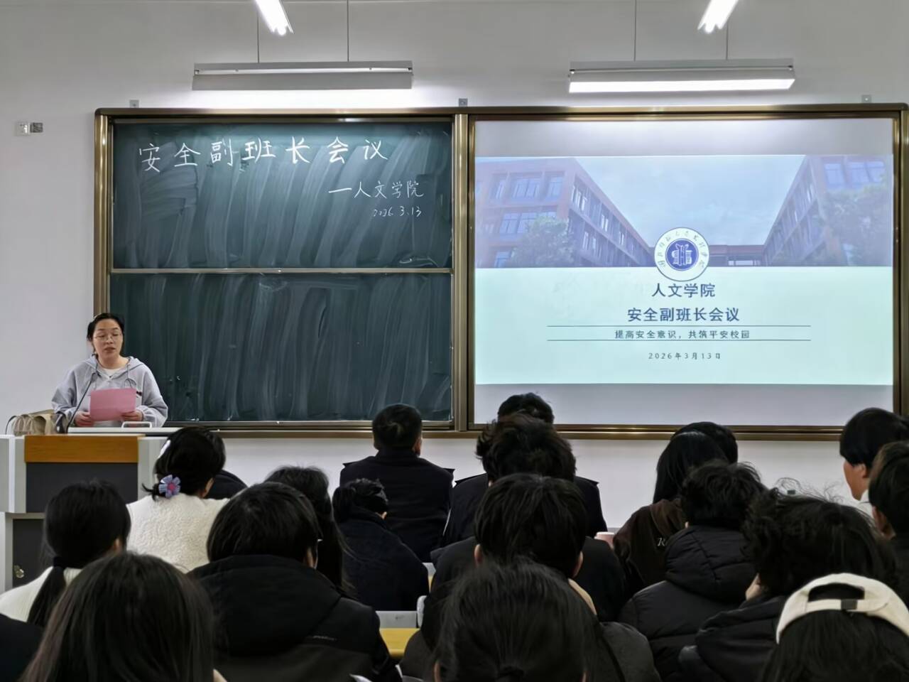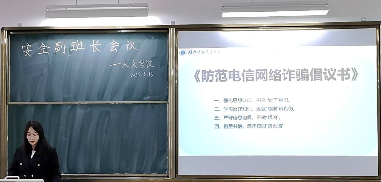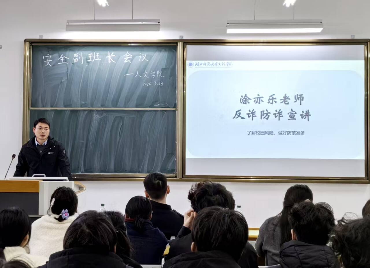 为切实提升学生防骗意识,筑牢校园安全防线,2026年3月13日,人文学院于J3-112教室组织召开安全副班长反诈专题会议。全体安全副班长参会,共同学习反诈知识,凝聚校园防诈合力。湖北师范大学文理学院人文学院党总支书记周景斌、团总支书记胡文玉;湖北师范大学文理学院后勤部保卫科科长涂亦乐;黄石市汪仁镇派出所余警官、陈警官出席指导,学院全体辅导员老师及团总支学生会主席团全体成员参会。