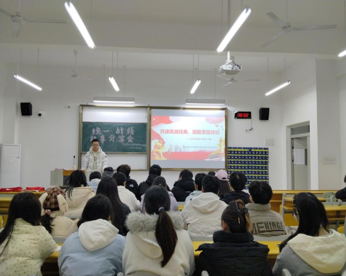 活动以“党员领学、小组讨论、代表分享”为主线展开。主持人在开场中系统阐释了统一战线“大团结大联合”的核心内涵及其在民族复兴进程中的重要价值。两位学生党员分别从不同维度进行了深入领学:一位结合新时代生动实践,展现了统一战线在凝聚人心、服务发展中的重要作用;另一位通过鲜活的历史故事,回顾了统一战线作为党的“重要法宝”的光辉历程,让同学们深刻感受到团结奋斗的历史传承。