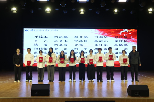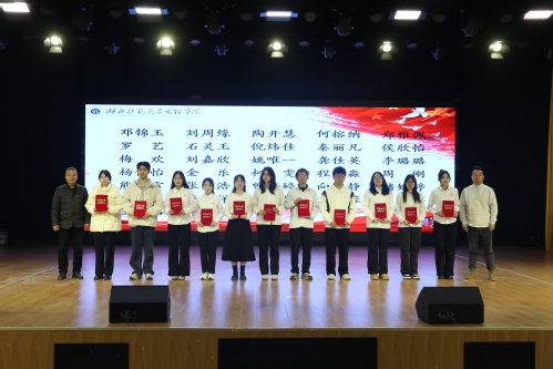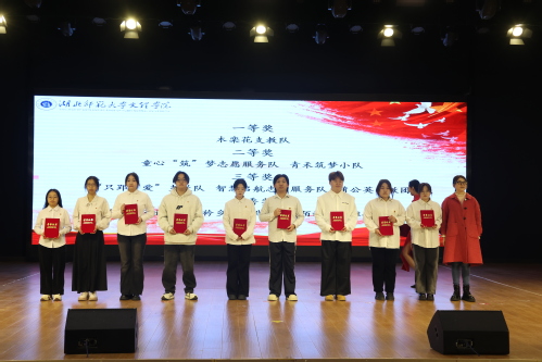 学工部部长刘建上台宣读了表彰决定。对2024-2025学年度在志愿服务工作中表现突出的40名优秀志愿者与志愿者标兵、9支暑期优秀社会实践团队及2个优秀青支队予以表彰,校领导为获奖代表颁发证书。