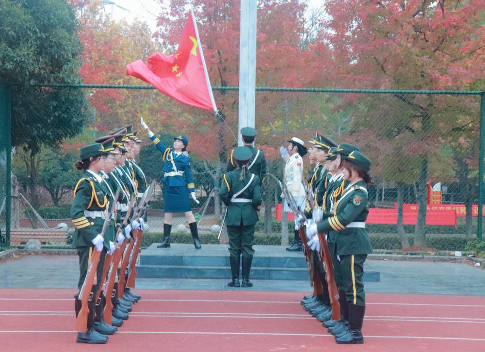 伴随着主持人曹式成洪亮的宣告,升旗仪式正式开始。国旗护卫队步伐铿锵,护送国旗走向旗台。全体师生肃立注目,神情庄重。在雄壮的国歌声中,五星红旗冉冉升起,迎风飘扬,将深沉的爱国情怀与奋进力量深深植根于师生心中。