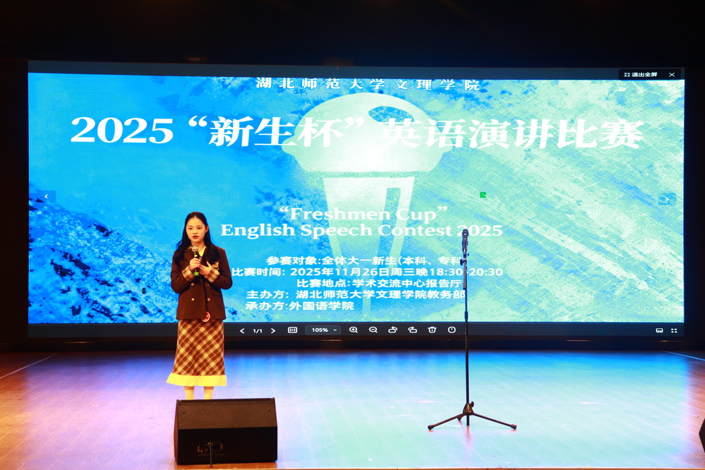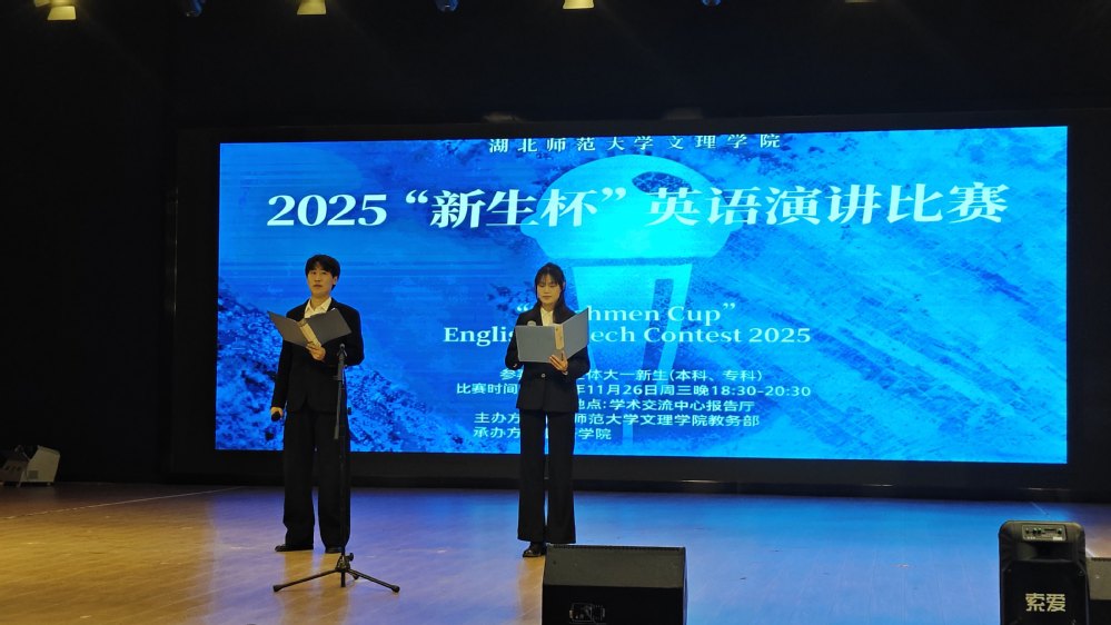 为搭建学生英语能力展示平台,促进跨文化交流与思想碰撞,1126日晚,由湖北师范大学文理学院教务部主办、外国语学院承办的2025“新生杯”英语演讲比赛决赛在学术交流中心圆满落幕。教务部部长刘江燕、督导刘金梅教授、外国语学院院长郑桃云教授作为特邀嘉宾出席活动。评审团由刘金梅教授、郑桃云教授、外国语学院各教研室主任及专业教师共同组成,确保比赛的专业性与公正性。现场六百余名师生齐聚一堂,共同见证了一场语言艺术与家国情怀交相辉映的英文盛宴。