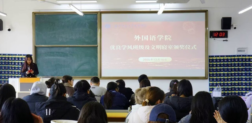 为切实推进优良学风建设,充分发挥先进集体的示范引领作用,2025年12月16日12时,湖北师范大学文理学院外国语学院优良学风班级及文明寝室评比活动在J3-310教室顺利举行。学工办负责人张一能、团学指导老师杨峰、宣传指导老师汪宜心、活动指导老师余天喜莅临现场,与学院23、24、25级全体学生共同参与本次活动。