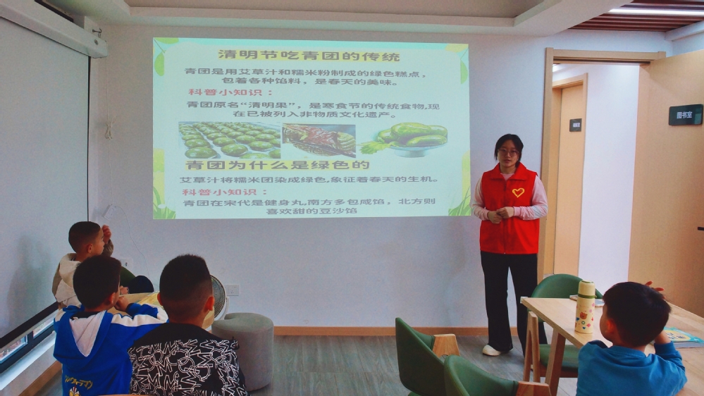 活动伊始,志愿者以青团为切入点,为社区大小朋友们带来了一堂生动鲜活的中华传统食俗文化课。从青团与寒食节、清明节的历史渊源,到艾草入食的养生智慧,再到南北风味的文化差异,志愿者们用通俗易懂的语言,串联起千年民俗的文化脉络,让孩子们在聆听中读懂传统、敬畏传统,让中华优秀传统文化在潜移默化中代代相传。