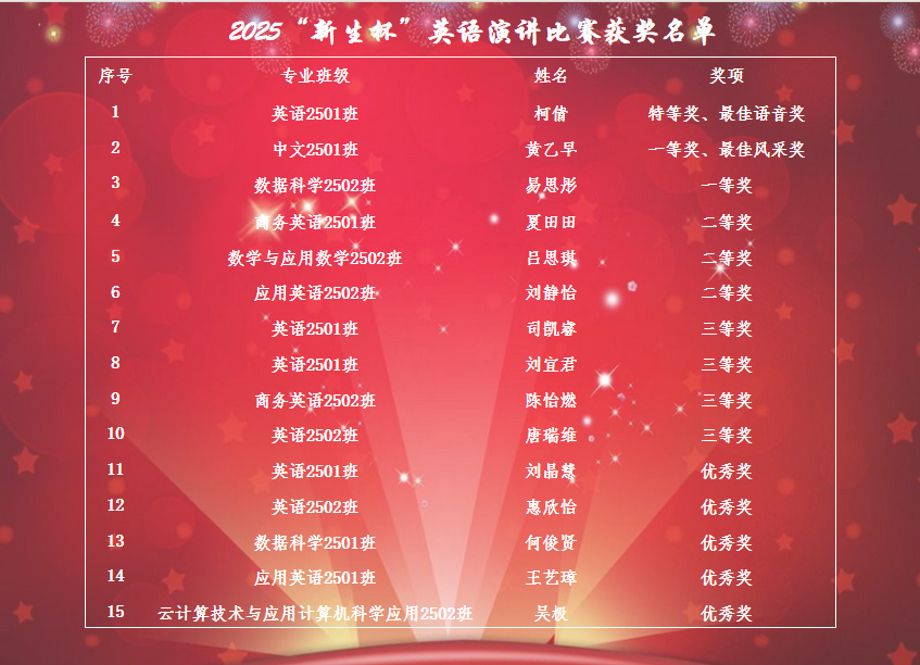 此次比赛不仅为新生们提供了一个展示自我的舞台,更强化了学生的家国情怀与时代担当,为学校培养国际化、复合型人才提供了有力支撑。愿所有湖师文理学子以此次比赛为契机,载着对语言的热爱,怀揣勇气与担当,在人生的新征程上步履不停,续写辉煌。