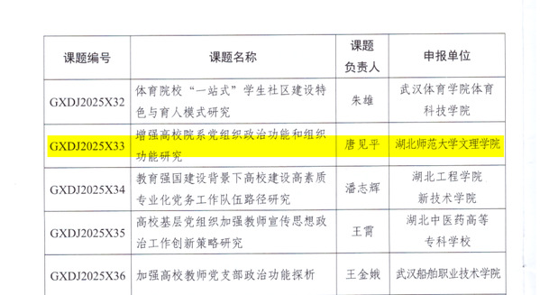 本网讯(通讯员 余复军)近日,湖北省高等学校党建研究会印发《关于公布2024—2025 年党建研究课题立项结果的通知》,我校马克思主义学院教师唐见平申报的课题《增强高校院系党组织政治功能和组织功能研究》成功获批立项,实现了我校在省级高等学校党建研究课题申报工作中的新突破。