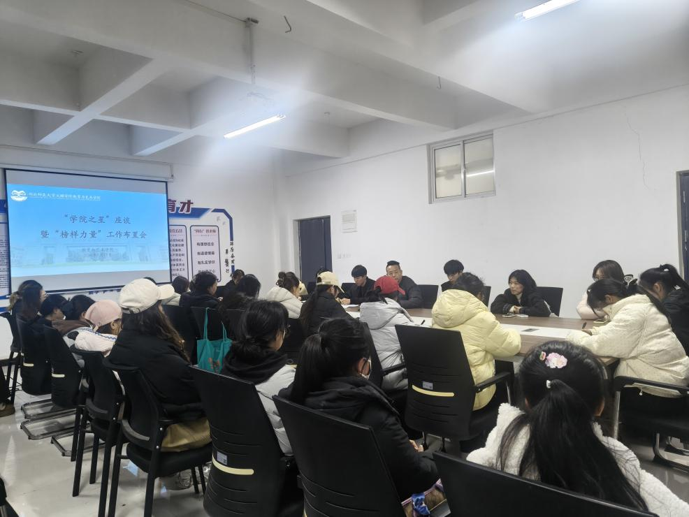随后,会议重点围绕如何发挥“学院之星”的示范引领作用进行了深入研讨,从“认识榜样、践行榜样、超越榜样”三个方面对他们提出了期望与要求,并对下一阶段学风建设工作作出具体部署,正式启动“礼赞榜样力量策马领航新程”进班宣讲活动。会议上围绕“凝聚榜样力量”确立了“学院之星”常态化交流机制,持续跟踪优秀学子的成长发展。