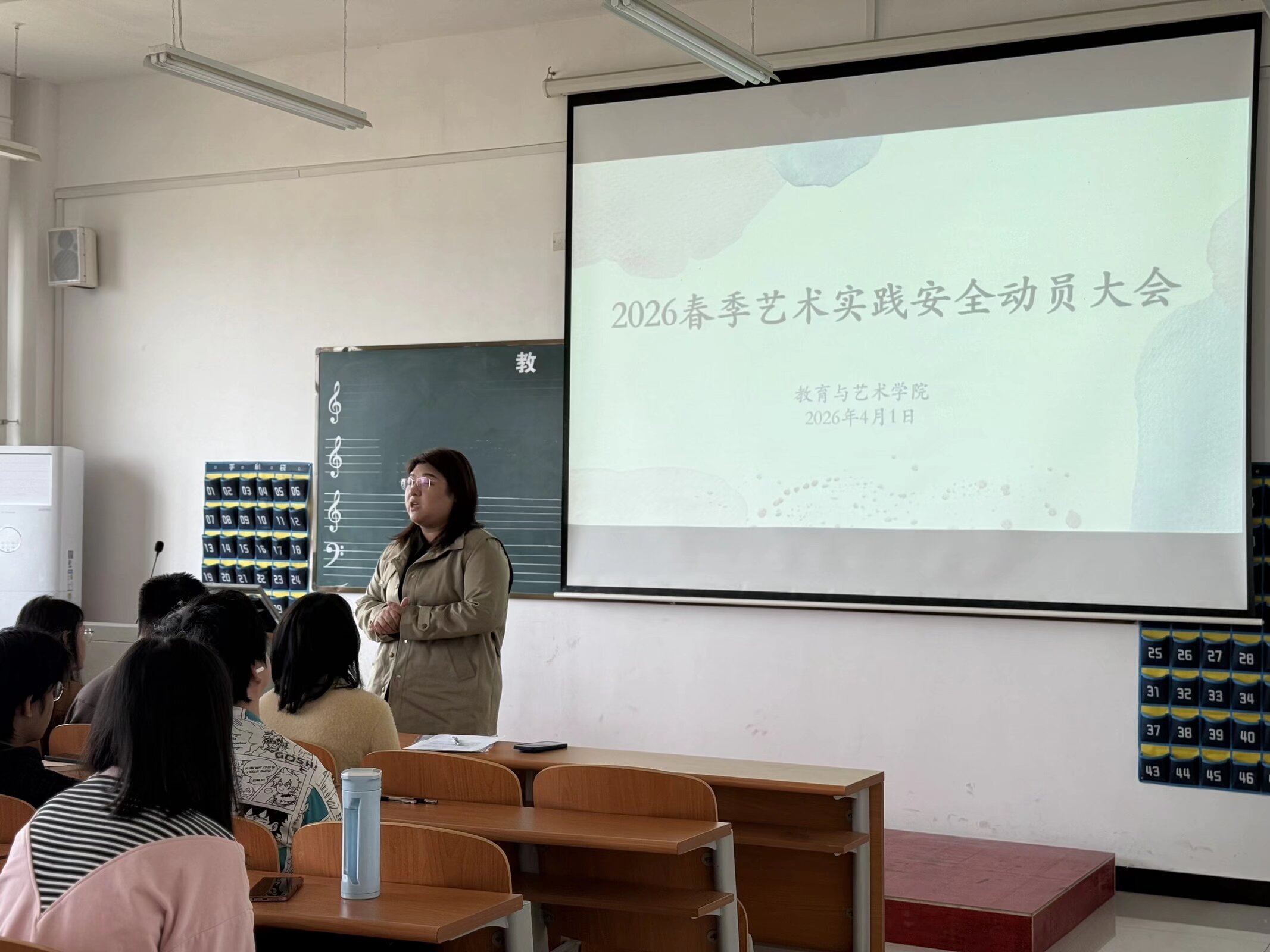 2026年4月1日中午12点,教育与艺术学院美术学专业于1号实验楼403教室开展2026年春季艺术实践安全动员会议,教育与艺术学院胡蕾副院长、美术专业学科带头人徐俊超主任、2025级美术学专业辅导员韩幸老师、本次写生带队汤澜、王雷、张子谦老师及全体2025级美术学专业学生参会。