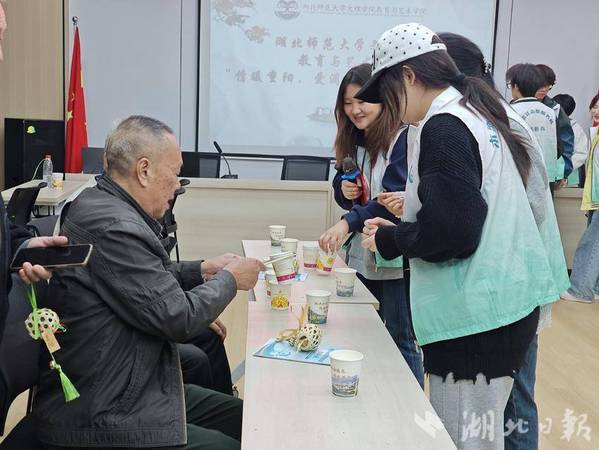 活动开始,湖北师范大学文理学院教育与艺术学院团学会青支队志愿者们耐心地向老人们分发竹丝、彩线、香料等材料。他们“青老”搭配,一同协作,体验传统重阳香囊的制作。