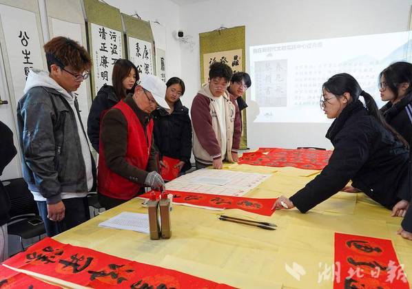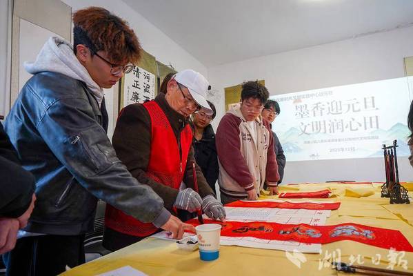 湖北日报客户端讯(通讯员吴忧)12月29日上午,源建里社区三楼活动室内墨香四溢、暖意融融,一场以“墨香迎元旦,文明润心田”为主题的新时代文明实践活动在这里温馨举行。活动特邀黄石市书法协会徐少煌老师和书法爱好者谢志刚老师现场指导,来自湖北师范大学文理学院智能交通与应用学院的大学生们参与其中,共同感受传统文化魅力,喜迎2026年元旦佳节。