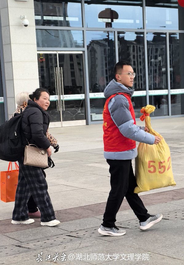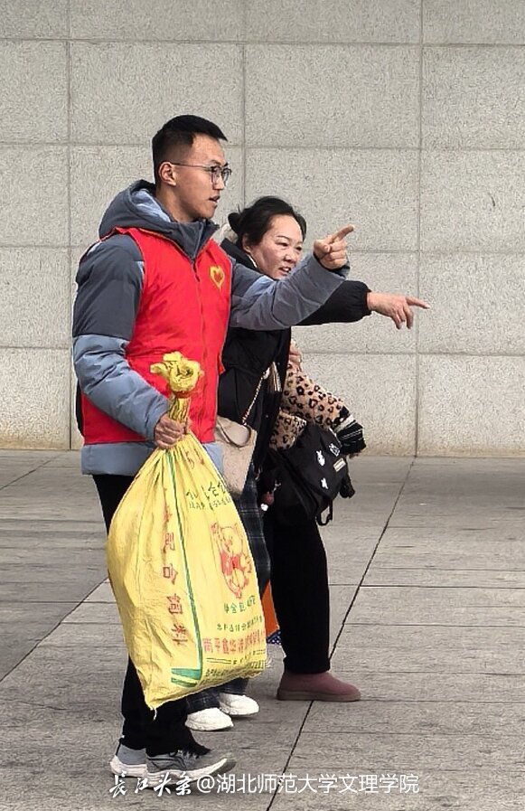 “请往这边走,自动取票机在候车厅左侧。”“阿姨,我帮您拿这个箱子,送您到进站口。”“这是泰宁旅游导览图,您可以参考。”寒风中,嵇杰晨的声音温和而有力量,他穿梭在人流之中,主动为旅客指引路线、搬运行李、发放导览资料,耐心解答购票、候车、换乘等各类疑问,用细致周到的服务为奔波的旅客驱散冬日寒意。他的身影,是湖北师范大学文理学院学子投身返乡志愿服务的生动缩影,也展现了当代青年学子的热忱与坚守。