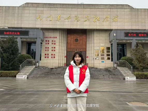 天门烈士陵园内,松柏苍翠、庄严肃穆,团队成员杨思琦怀着崇敬之心走进这片红色阵地。在高耸的烈士纪念碑前,她仔细整理好胸前的团徽,静静伫立、深深鞠躬,轻声默念碑上镌刻的每一位烈士姓名,以此寄托对革命先烈的缅怀之情。在陵园的革命史料展厅里,杨思琦驻足凝视、逐件端详每一件展品,不时停下脚步记录感悟,主动向讲解员请教烈士们的英雄事迹,沉浸式感受革命年代的峥嵘岁月。村民口中流传的红军故事,更让她真切体会到红色精神在天门大地的生生不息、代代相传,也深刻读懂了“红色种子”扎根大地、滋养人心的深刻内涵。