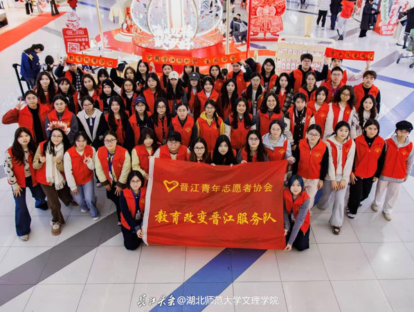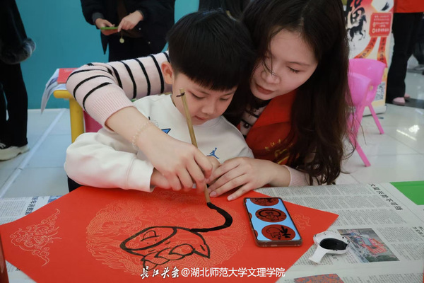 2026年春节前夕,福建省泉州市晋江市福埔S.M国际广场人头攒动、暖意融融。负一楼中庭区域,身着红色马甲的志愿者正带领小朋友在红宣纸上书写大大的“福”字、创作新春春联,湖北师范大学文理学院教育与艺术学院学子苏泺涵便是其中一员。此次“迎新春 送祝福”活动由共青团晋江市委员会、晋江青年志愿者协会联合主办,苏泺涵与多名归乡学子组成大学生志愿服务队,以笔墨为媒,为广大居民送上新春的美好祝福。