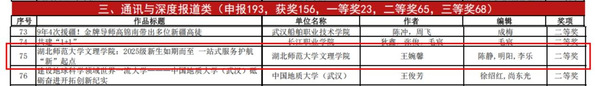 本网讯 近日,2025年度湖北高校新闻奖评选结果正式公布,我校校内外各类媒体平台发布的5件作品,获二等奖3项,三等奖2项。