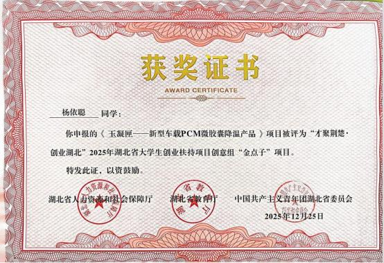 杨依聪同学的《玉凝匣——新型车载PCM微胶囊降温产品》项目,聚焦车载温控领域的技术痛点,研发出新型 PCM微胶囊降温产品,在提升车辆温控效率的同时兼具环保与安全特性,为车载温控技术创新提供了新的解决方案。