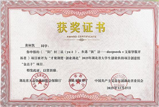 本网讯(通讯员 江云鹤)近日,“才聚荆楚·创业湖北”2025年湖北省大学生创业扶持项目评选结果揭晓。我校学子黄林凯、杨依聪两位同学申报的创业项目,从众多参赛项目中脱颖而出,双双荣获创意组“金点子”项目,充分展现了我校学子在创新创业领域的扎实素养与蓬勃活力。