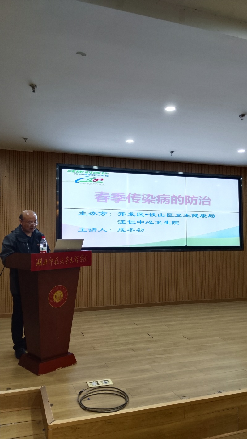 讲座伊始,成冬初主任围绕春季常见传染病类型,重点讲解了流感、水痘、诺如病毒感染性腹泻、过敏性疾病等高发病症的传播途径、临床症状与辨别方法。成冬初主任结合校园生活实际,用通俗易懂的语言,详细科普了科学防控要点,从日常个人卫生习惯养成、教室宿舍通风消毒、合理膳食与作息、体育锻炼增强体质、患病及时就医与隔离等方面,给出全面且实用的防护建议,提醒师生时刻提高防控意识,做到早预防、早发现、早治疗,从源头阻断传染病在校园内传播。