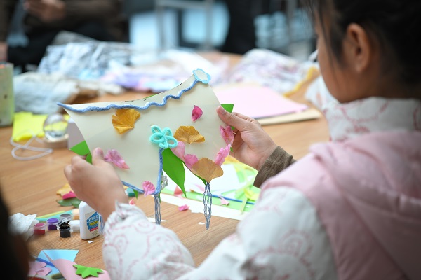 活动第二项,非遗云肩手工环节。经济与管理学院田蓉蓉老师向孩子们介绍了云肩作为古代服饰配件的文化内涵:“它不仅是装饰,更寄托着吉祥如意的寓意。”台下,志愿者们化身“小教师”,协助孩子们认真裁剪卡纸、粘贴纹样、串起珠花,一步步将想象转化为手中的作品。活动接近尾声,孩子们纷纷将亲手制作的云肩披上肩头,现场气氛达到高潮。轻盈的剪纸云肩随着孩子们的步伐轻轻摆动,传统纹样与现代童真碰撞出别样风采。