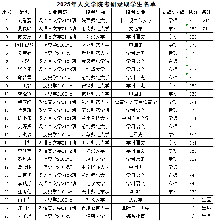 2025年,人文学院考研录取成果丰硕,共有25名学生成功考取国内外高校研究生。其中,2名学生被211院校录取,汉语言文学专业吴俊峰考取湖南师范大学、刘馨蔓考取陕西师范大学,其他学生录取学校涵盖内地重点师范院校、境外知名高校等多个层次,升学院校质量较高。