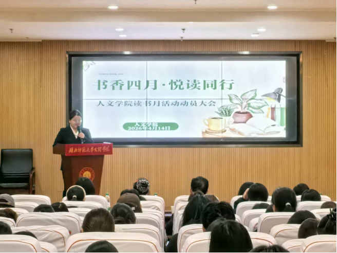 为营造浓厚校园文化氛围,响应学校读书月活动建设,在第29个世界读书日来临之际,2026年4月14日,湖北师范大学文理学院人文学院“书香四月・悦读同行”读书月动员大会在图书馆报告厅顺利举行。人文学院党总支书记周景斌、团总支书记胡文玉,学工办副主任丁书嫚以及辅导员出席。各班班委、团总支学生会全体成员以及学生党员代表参会。