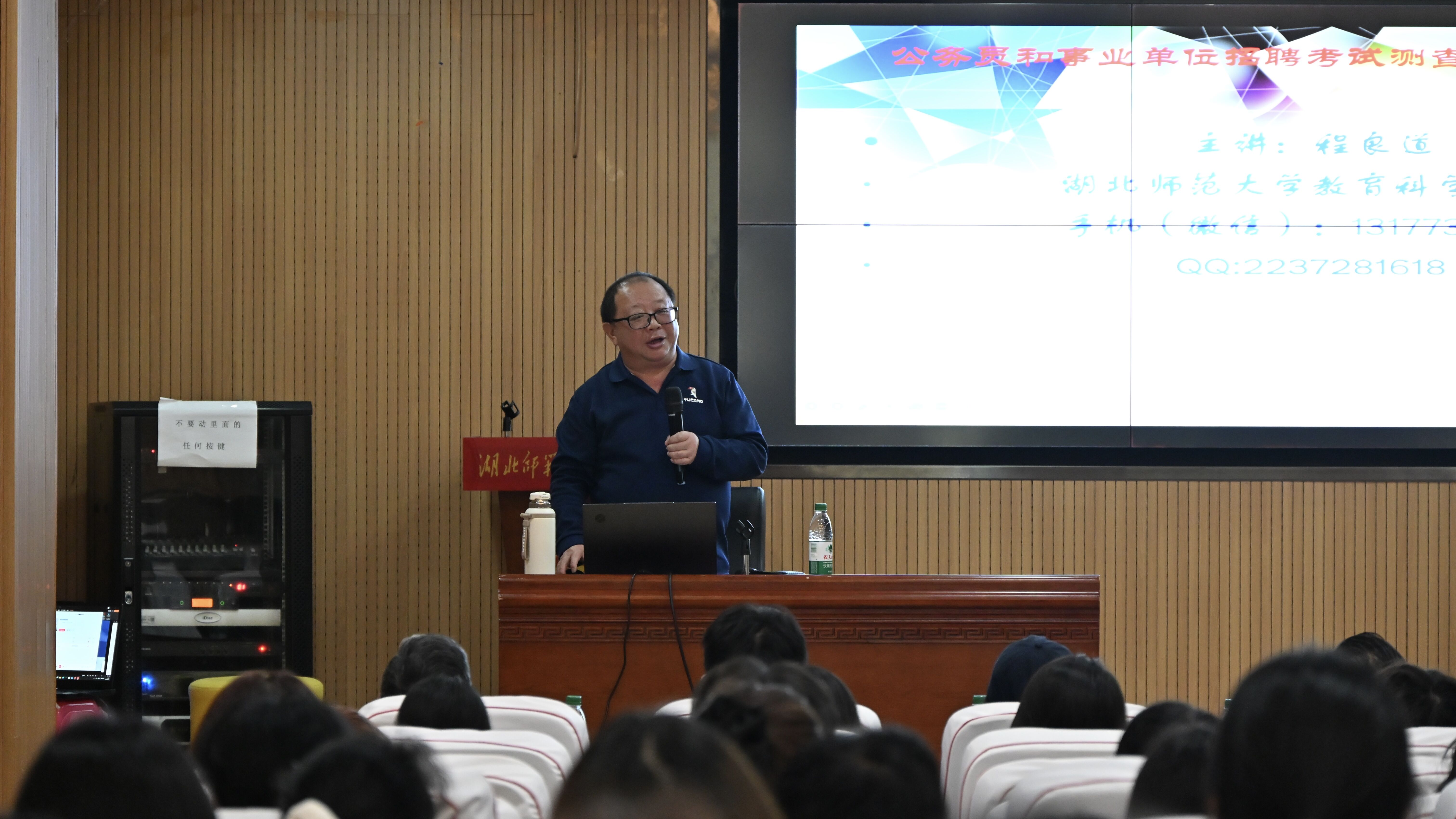 2026327日下午,在图书馆一楼报告厅,由湖北师范大学文理学院计算机与信息学院图书馆承办的考公考编应试技巧专题讲座如期启幕。本次活动特邀知名专家程良道教授担任主讲,旨在为备考学子提供精准指导,助力学子在公考之路上行稳致远。