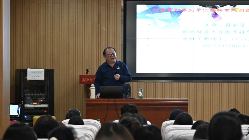 2026年3月27日下午,图书馆一楼报告厅,由湖北师范大学文理学院计算机与信息学院主办、图书馆承办的考公考编应试技巧专题讲座如期启幕。本次活动特邀知名专家程良道教授担任主讲,旨在为备考学子提供精准指导,助力学子在公考之路上行稳致远。
