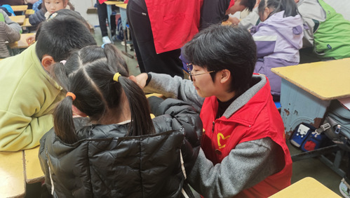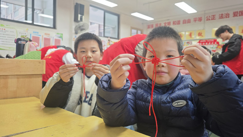 中国结编织现场同样气氛热烈。志愿者们耐心分解编绳步骤,从穿绳到打结,逐步引导。孩子们在动手实践中互相帮助,手指翻飞间,一个个寓意吉祥的中国结渐渐成形。活动中,党团员志愿者还自觉承担起现场协调与秩序维护工作,确保各环节流畅推进。