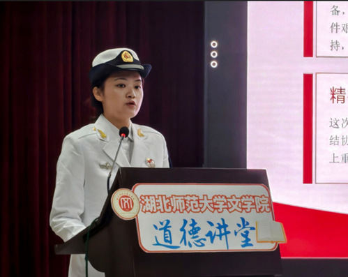 道德宣讲环节,彭江浩老师结合自己三十余年扎根一线教书育人经历,述说着一桩桩、一件件育人故事,传递师者力量,彰显育人温度。她谈到,教师的幸福感来自于耕耘的收获、学生的成长,累并快乐着!她强调,立德树人就是一棵树摇动另一棵树,一朵云推动另一朵云,一个灵魂唤醒另一个灵魂,并激励广大教师要把抗战精神、爱国热情融入血脉、铸入师魂,以创新教学理念重塑课堂,以扎实专业素养启迪智慧,以温暖教育情怀滋润心灵,践行“为党育人、为国育才”的使命与担当。2025级新闻与传播专业研究生张思澳,作为一名海军退役士兵,分享了军旅淬炼中的“酸甜苦辣”,在一场场训练、一次次任务中以实际行动传承发扬抗战精神,努力成为既能扛得起责任,也能拿得出成绩的新时代大学生。