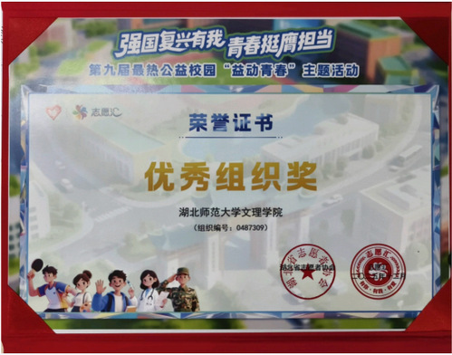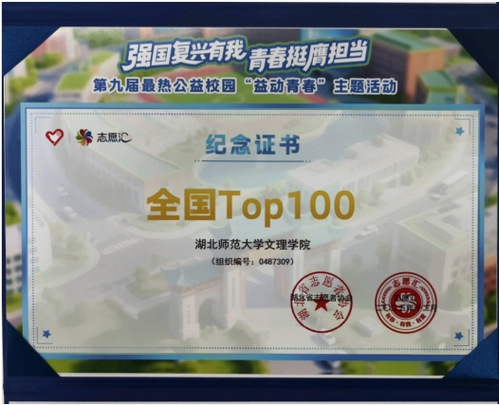 (通讯员:李晓芳)青春筑公益,荣光载誉归!在第九届“益动青春”最热公益校园活动中,湖北师范大学文理学院青年志愿者协会凭借全校志愿者的踊跃参与、积极奉献,荣获全国TOP100最热公益校园、优秀组织单位称号!这份荣誉,由每一位文理志愿人共同铸就!