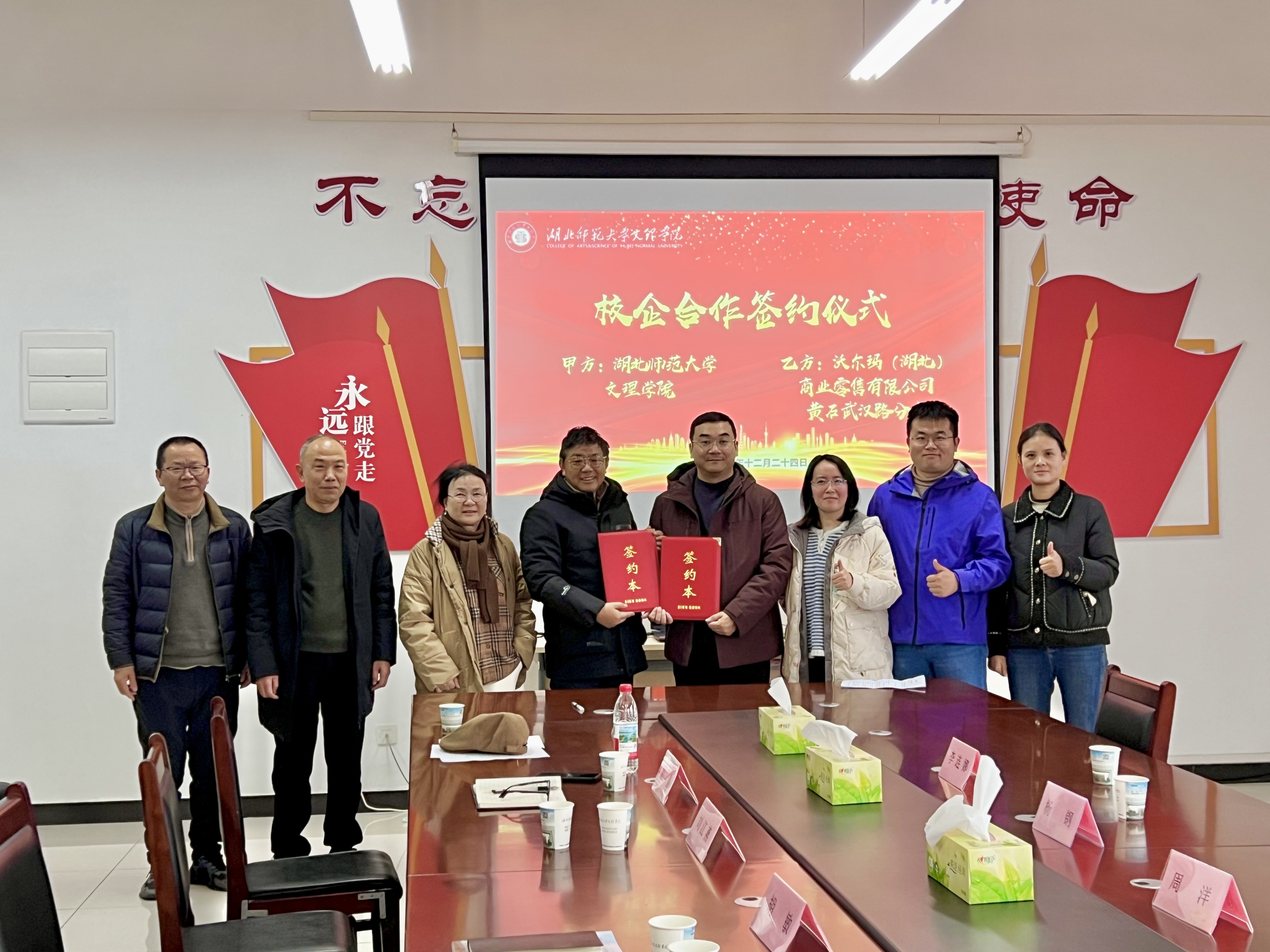 2025年12月24日上午10时,沃尔玛(湖北)商业零售有限公司黄石市武汉路分店与湖北师范大学文理学院实习合作协议签约仪式在2-213会议室成功举行,双方代表共同签署协议。会议由经济与管理学院辅导员邓忻吾主持。沃尔玛黄石武汉路分店总经理杨钢、副总经理周洋、人事行政经理李连娜、培训主管周佩,湖北师范大学文理学院教务部部长刘江燕、副部长胡敏,经济与管理学院院长徐燕、副院长胡景桂等共同出席。