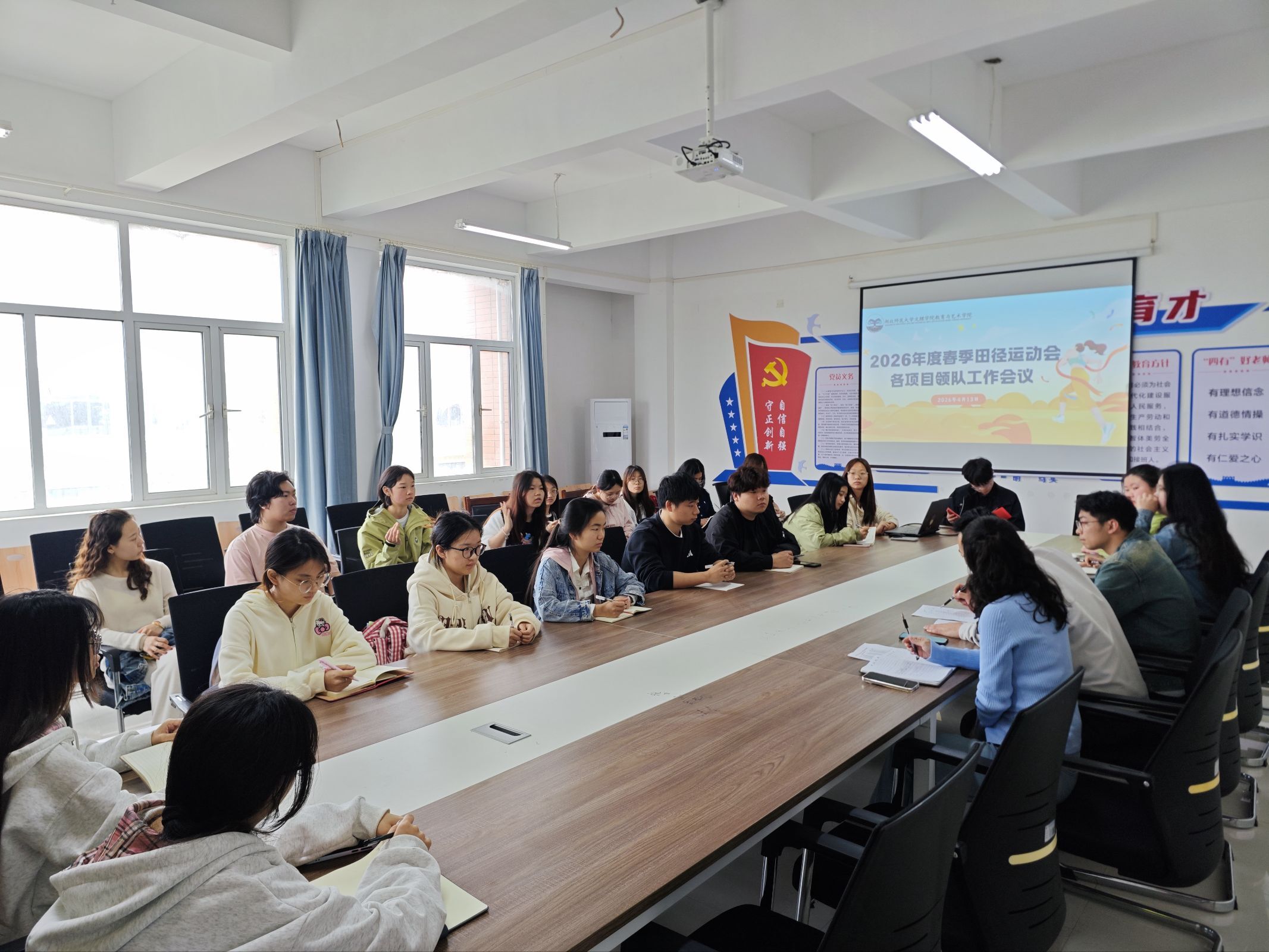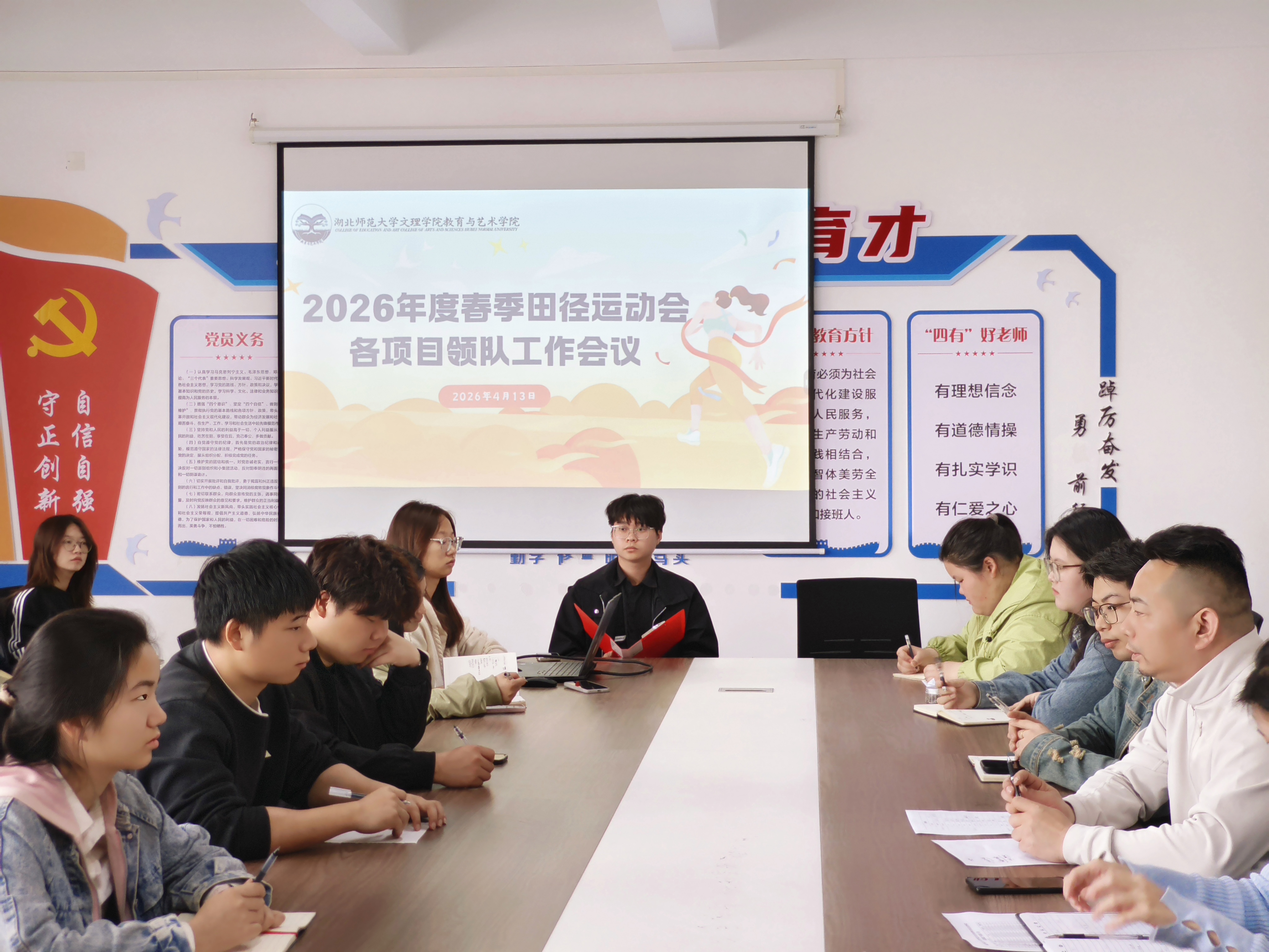 为进一步抓实春季田径运动会赛前集训工作,补齐日常训练短板,压实各领队带队责任,统筹推进运动员集训、开幕式展演、赛事宣传、后勤保障等各项筹备工作,全方位保障运动会有序筹备、安全参赛、赛出风貌。2026年4月13日,湖北师范大学文理学院教育与艺术学院在1号实验楼401会议室隆重召开运动会领队工作会议。
